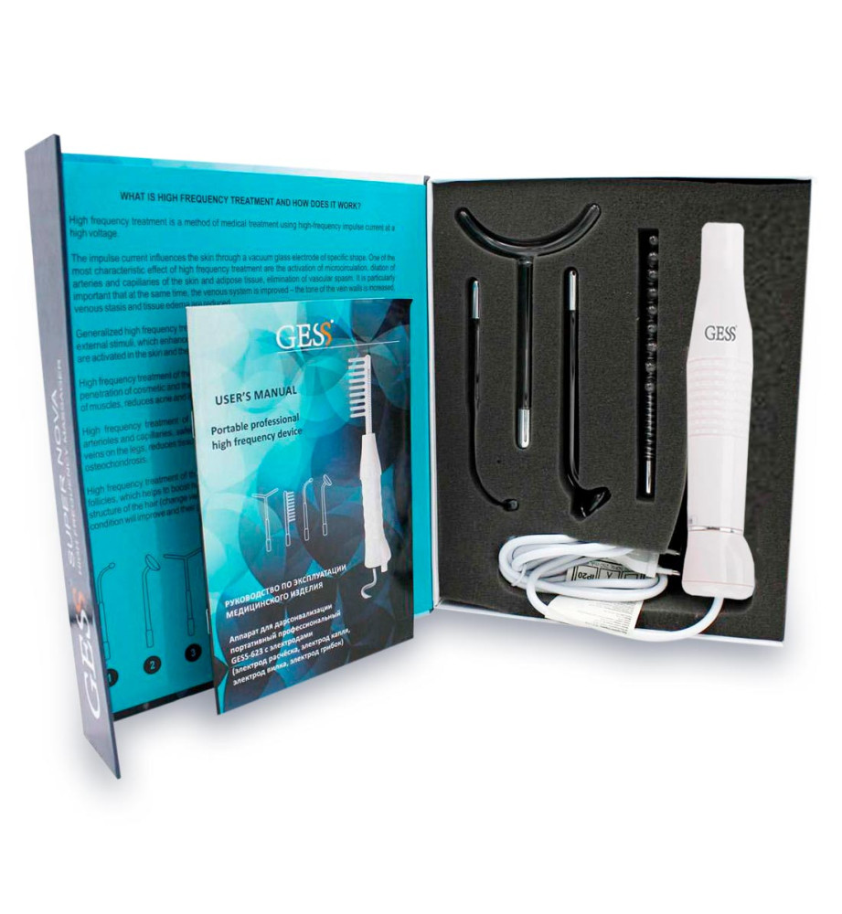 Аппарат для дарсонвализации с 4 видами насадок. За счет воздействия импульсным током на ткани тела предотвращает и борется с целым рядом проблем: угревая сыпь и высыпания, перхоть, варикозное расширение вен, мигрень, невралгия, артрит.