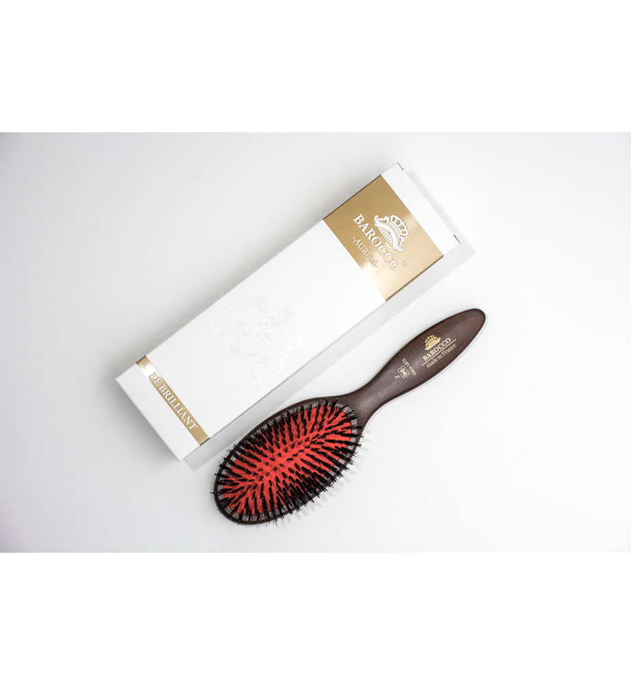 Головка щетки сделана из 100% щетины кабана. Натуральная щетина способствует естественному блеску, распределяя натуральные масла и предотвращая сечение кончиков.