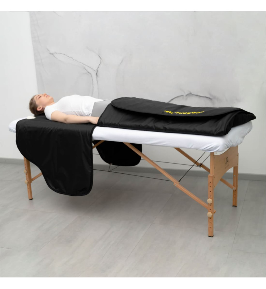 Термоодеяло для косметологии с плавной регулировкой нагрева от 35 до 55 градусом, автоотключением через 1 час использования. Электрическое одеяло с 2 независимыми зонами нагрева, влагостойким чехлом особенно популярно в сфере косметологии, где нужен прогрев. Конструкция одеяла с подогревом позволяет обернуть всё тело или оставить открытой верхнюю часть. В качестве нагревательного элемента используется карбоновое волокно, поэтому тепло от электроодеяла для косметологии инфракрасное, мягко согревает и проникает в глубокие слои во время процедур. Термоодеяло для обертывания с 1 пультом на 2 зоны прогрева. Пульт легко снимается, благодаря этому одеяло легко стирать. Размер 220х180 см, материал верха - нейлон с водоотталкивающей пропиткой, изготовлено в России, Санкт-Петербург, гарантия 12 мес.